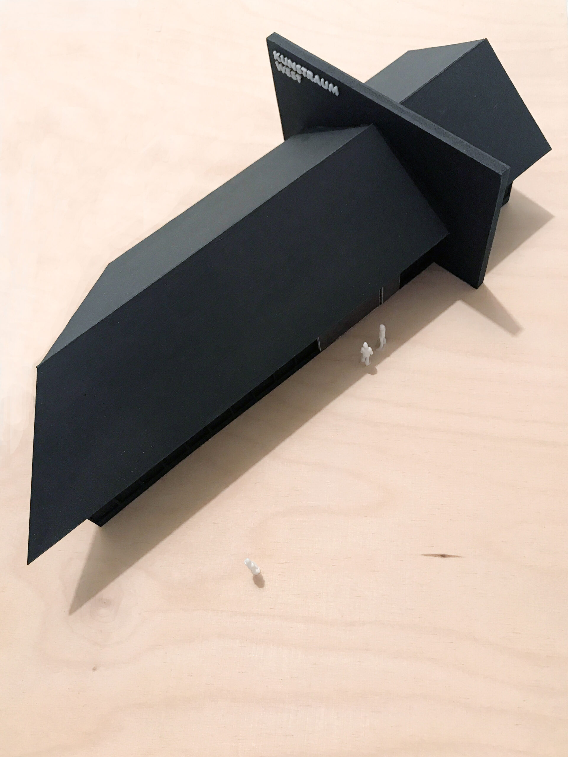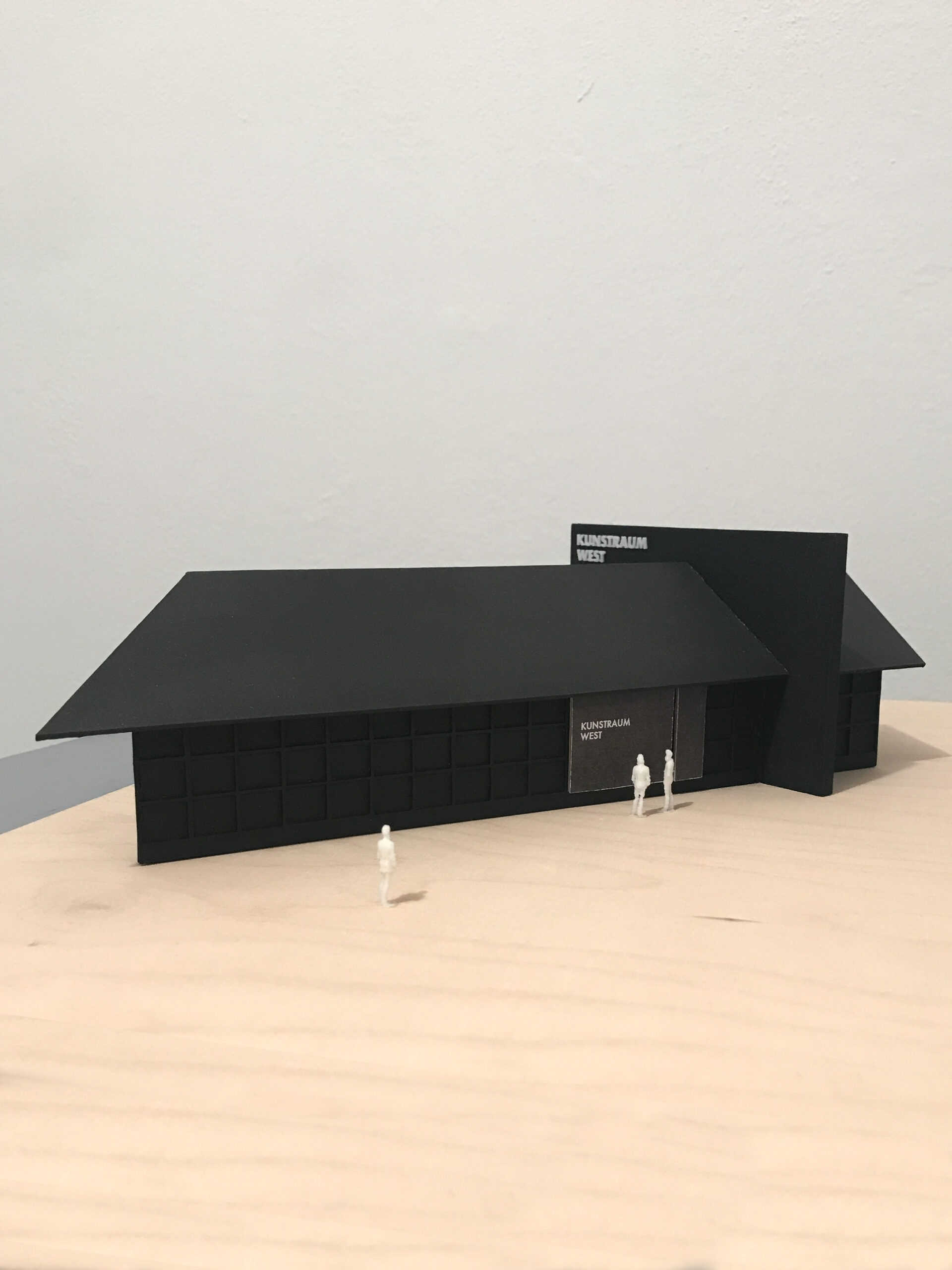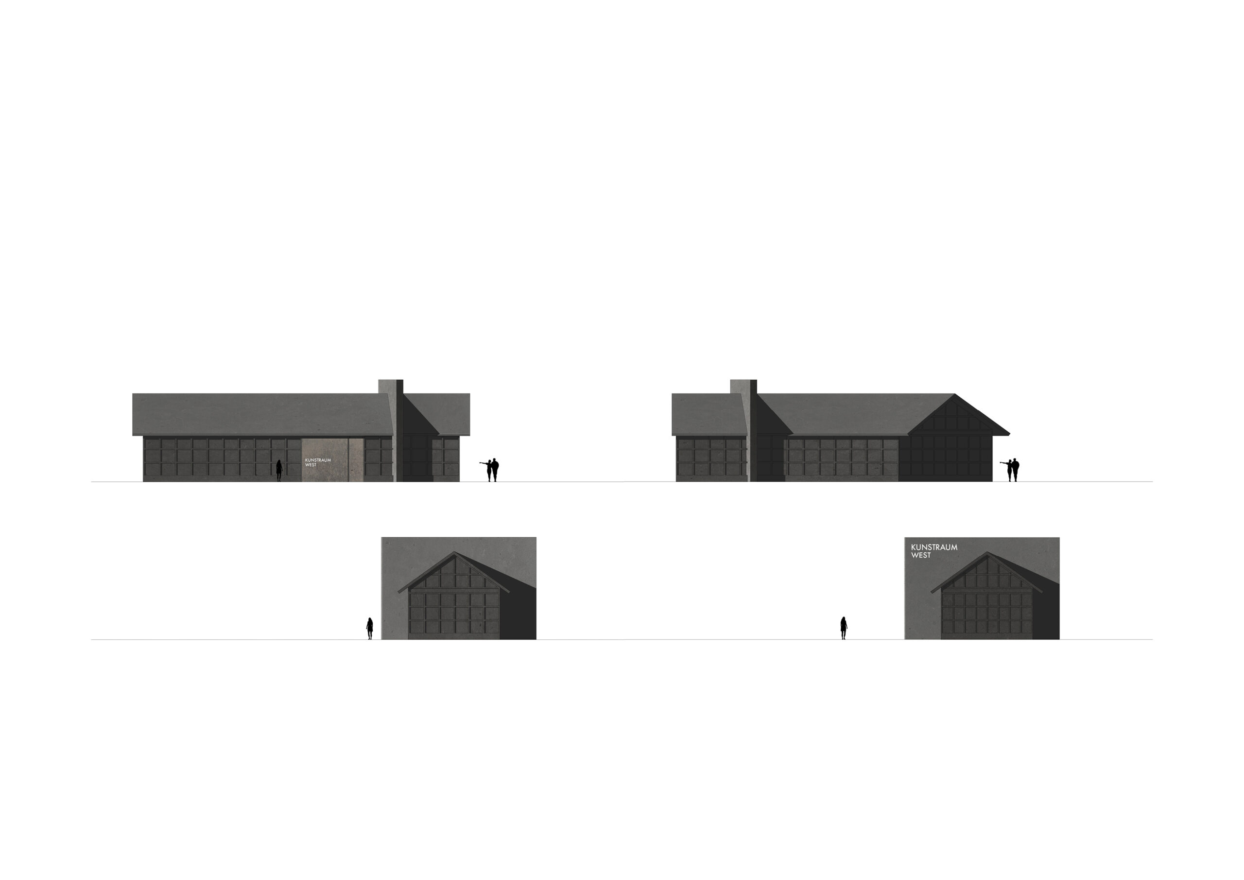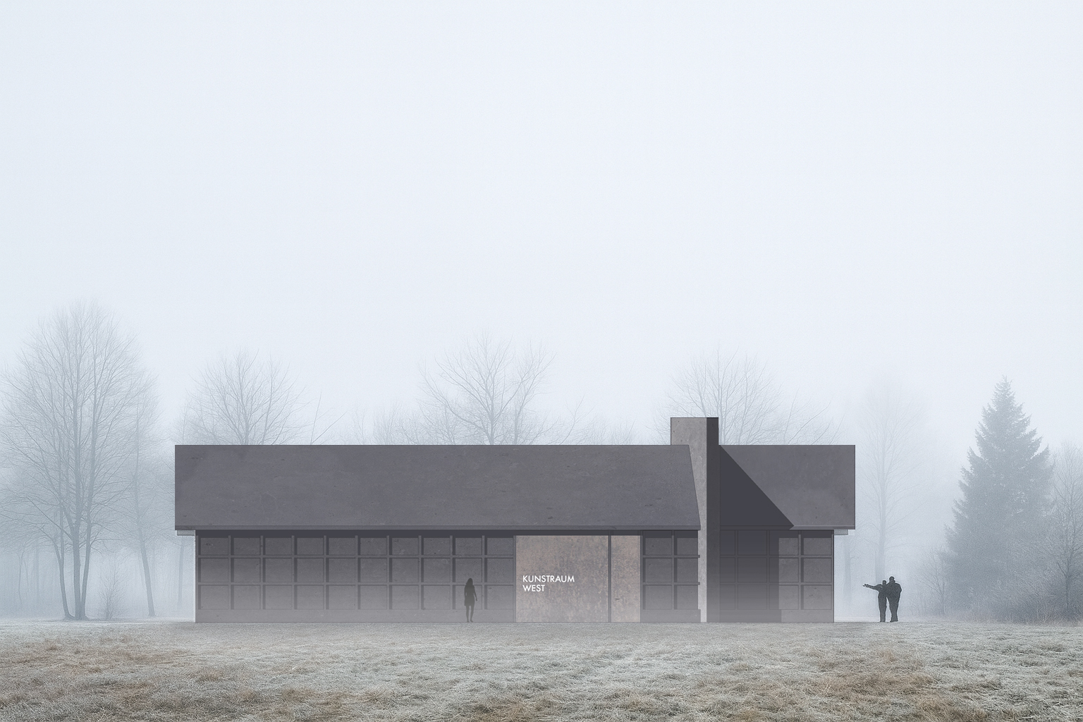 Der „Kunstraum West“ ist ein eingeschossiges, nicht unterkellertes Kunstgebäude mit rund 116m2 Ausstellungsfläche, allseitig aus schwarz eingefärbtem Dämmbeton angedacht. Wesentliche architektonische Absicht des Gebäudeentwurfes besteht in erster Linie darin, ein gutes Gebäude für den Ort und seine unmittelbare Umgebung zu schaffen. So erinnert der Entwurf auf den ersten Blick an die historisch wertvollen Nebengebäude früherer Herrschaftshäuser, wie sie vereinzelt, oft an Grünanlagen platziert, in der Zentrumsregion von Bümpliz zu finden sind. Durch lediglich zwei konzeptionelle Massnahmen wird das Gebäude auf die Ebene der Andersartigkeit gehoben und erfährt dadurch eine positive Irritation, welche es als Gebäude mit besonderer Nutzung auszeichnet, ohne als monumentaler Museumsbau mit ikonographischem Anspruch zu wirken. Die homogene Materialanwendung des schwarz eingefärbten Betons für sämtliche Gebäudebestandteile der Fassade, lässt das Projekt als einheitliches Volumen erscheinen und schafft dadurch gebäudetypologisch einen neuen und einzigartigen Typus.