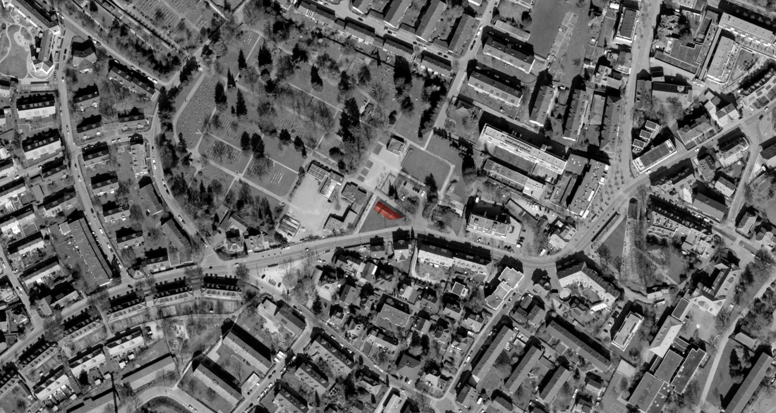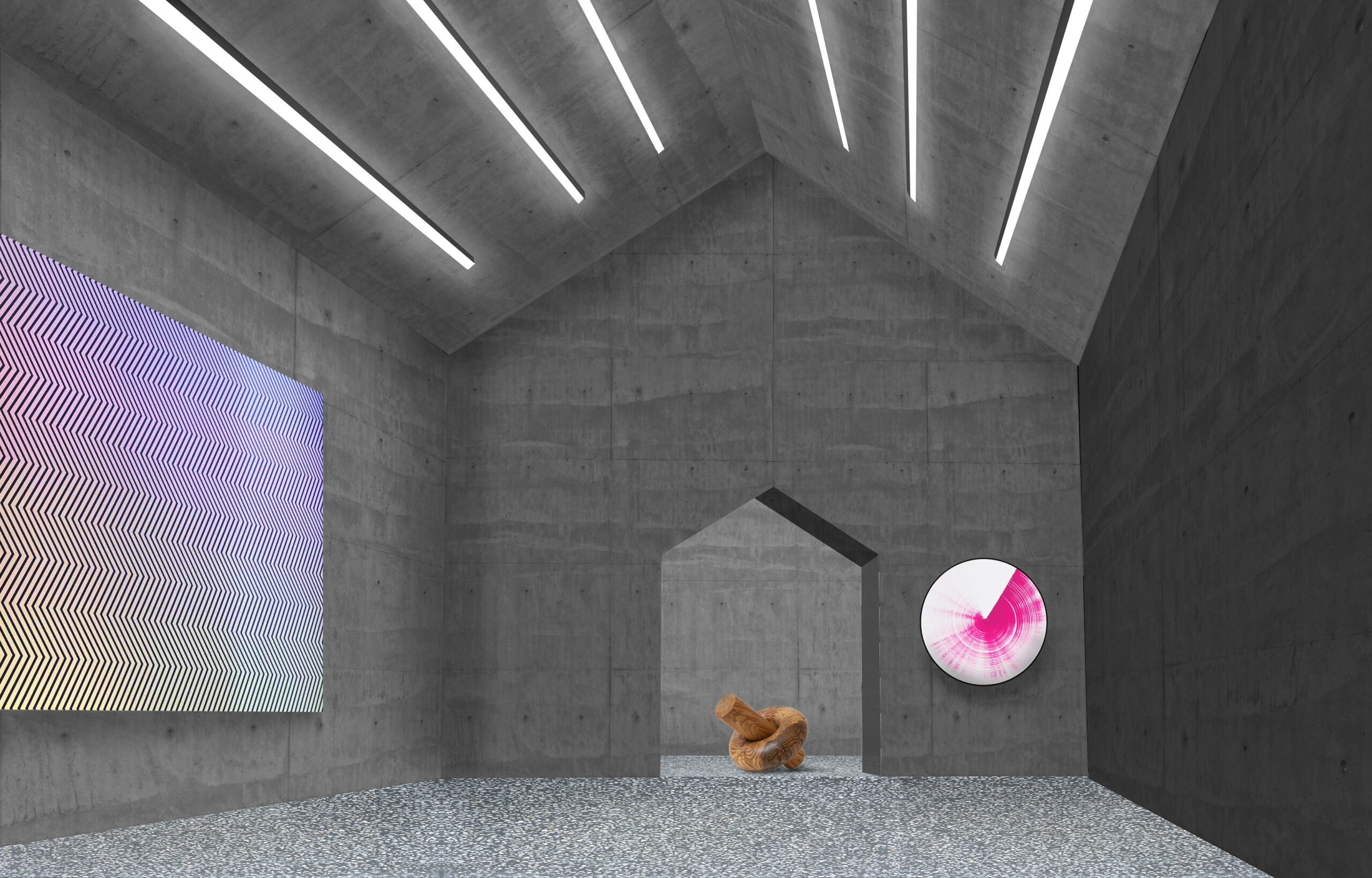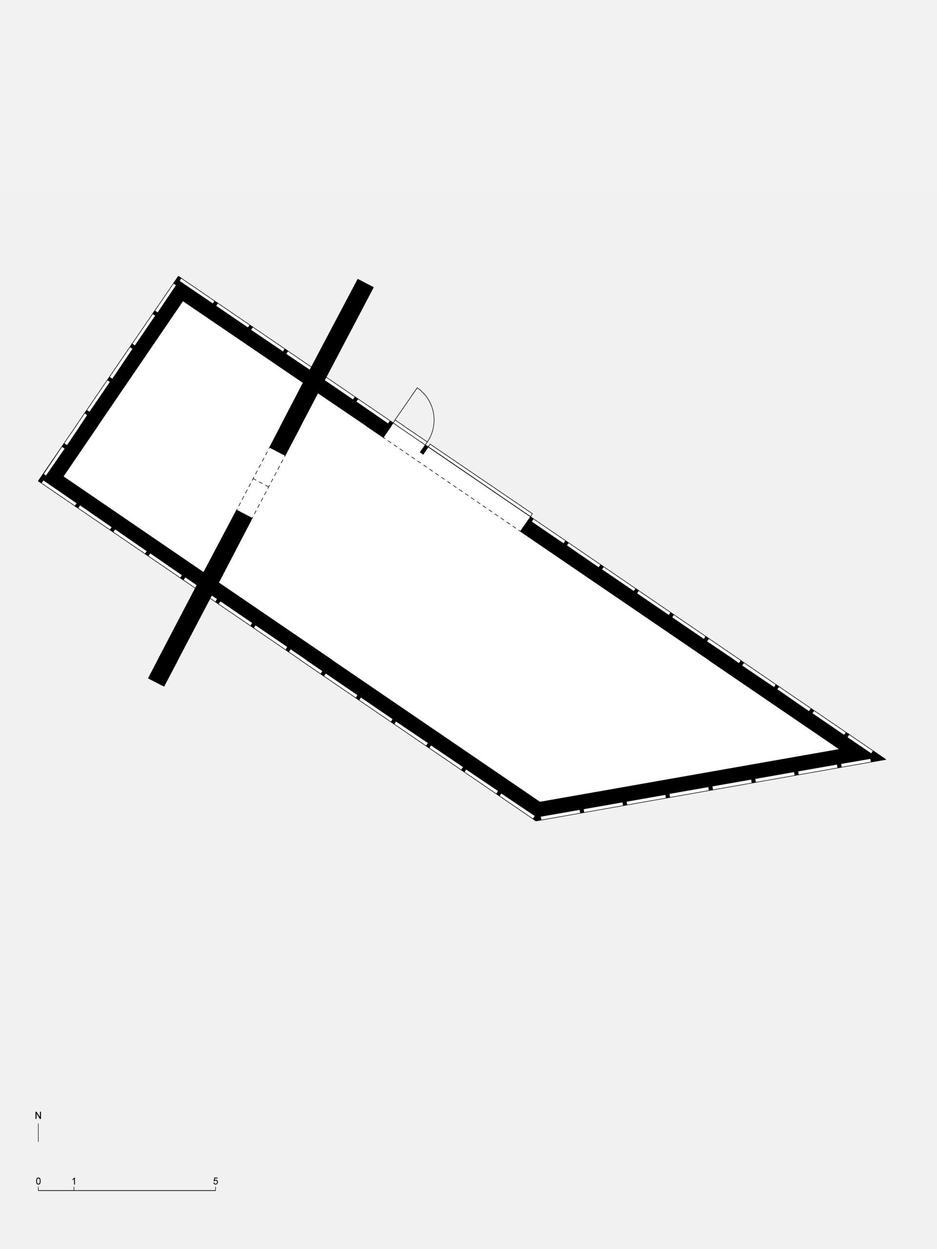 Eine ganzflächig gebäudedurchdringende Wandscheibe trennt das Innere in zwei Teilbereiche und verfremdet die vertraute Gebäudegeometrie. Durch diese simple Anwendung verliert das Gebäude unmittelbar die Wiedererkennbarkeit und die DNA eines regulären Gebäudes. Es wird somit ein Ort der Besonderheit mit eigenständigem, formellen Ausdruck geschaffen.