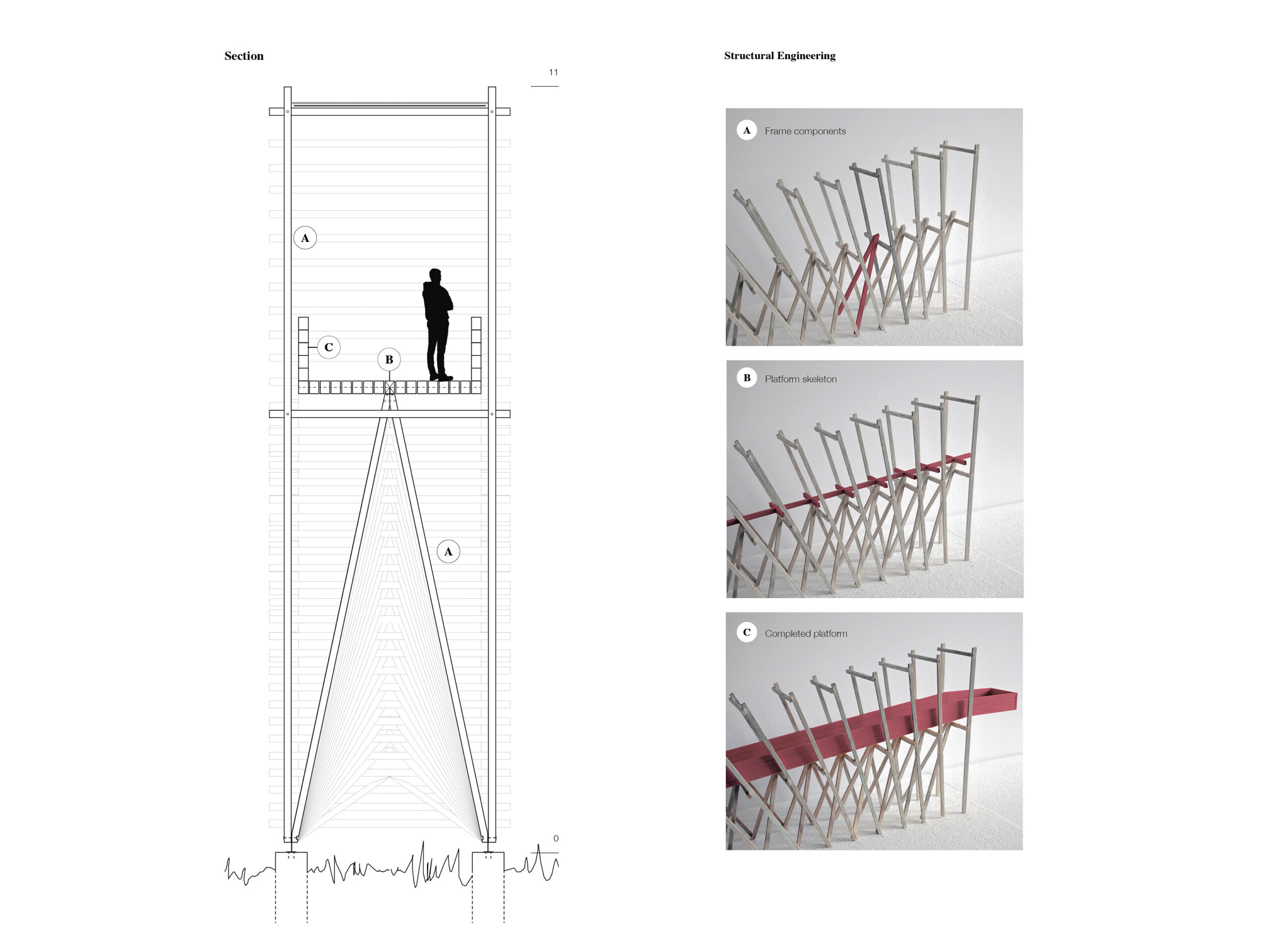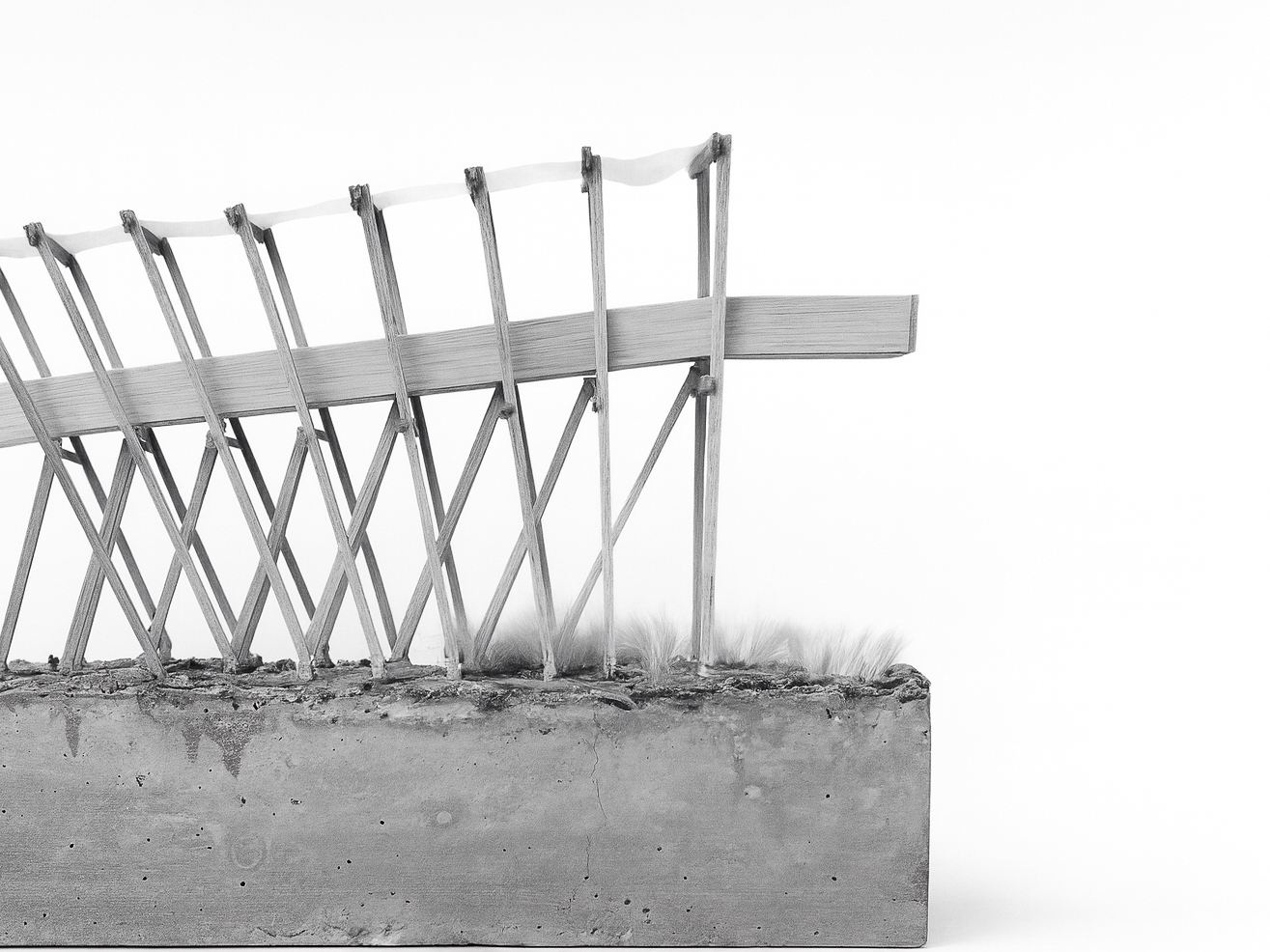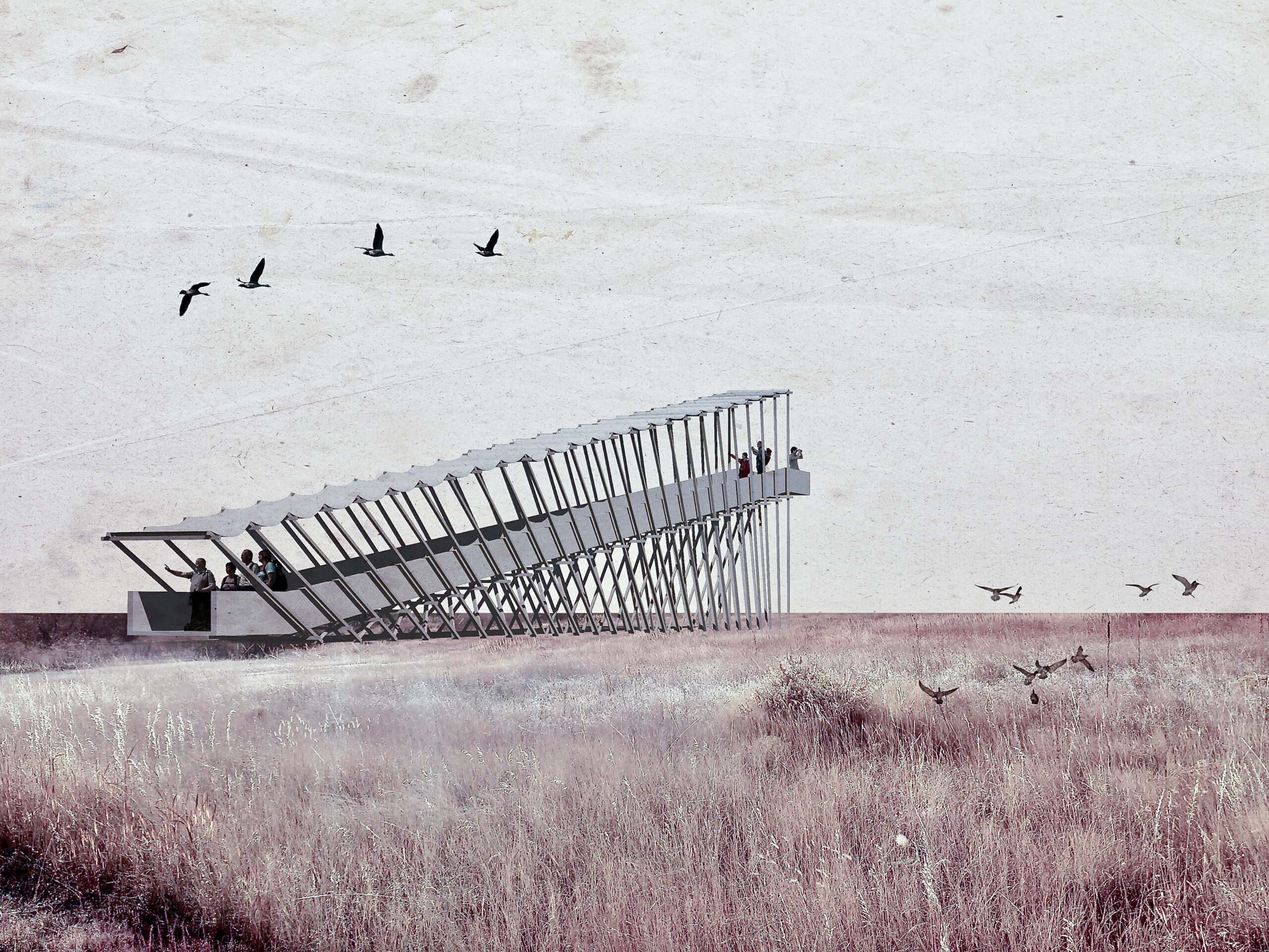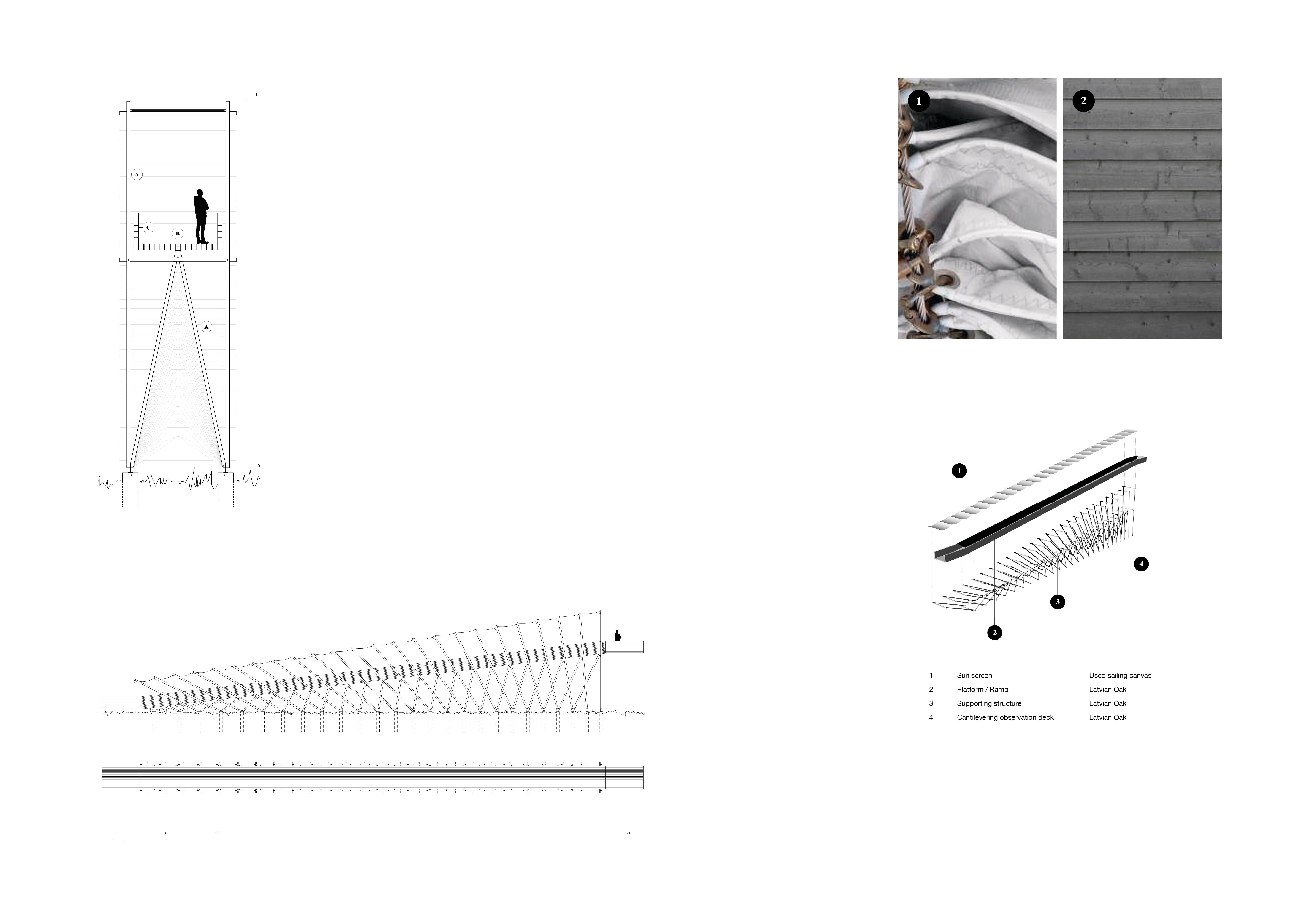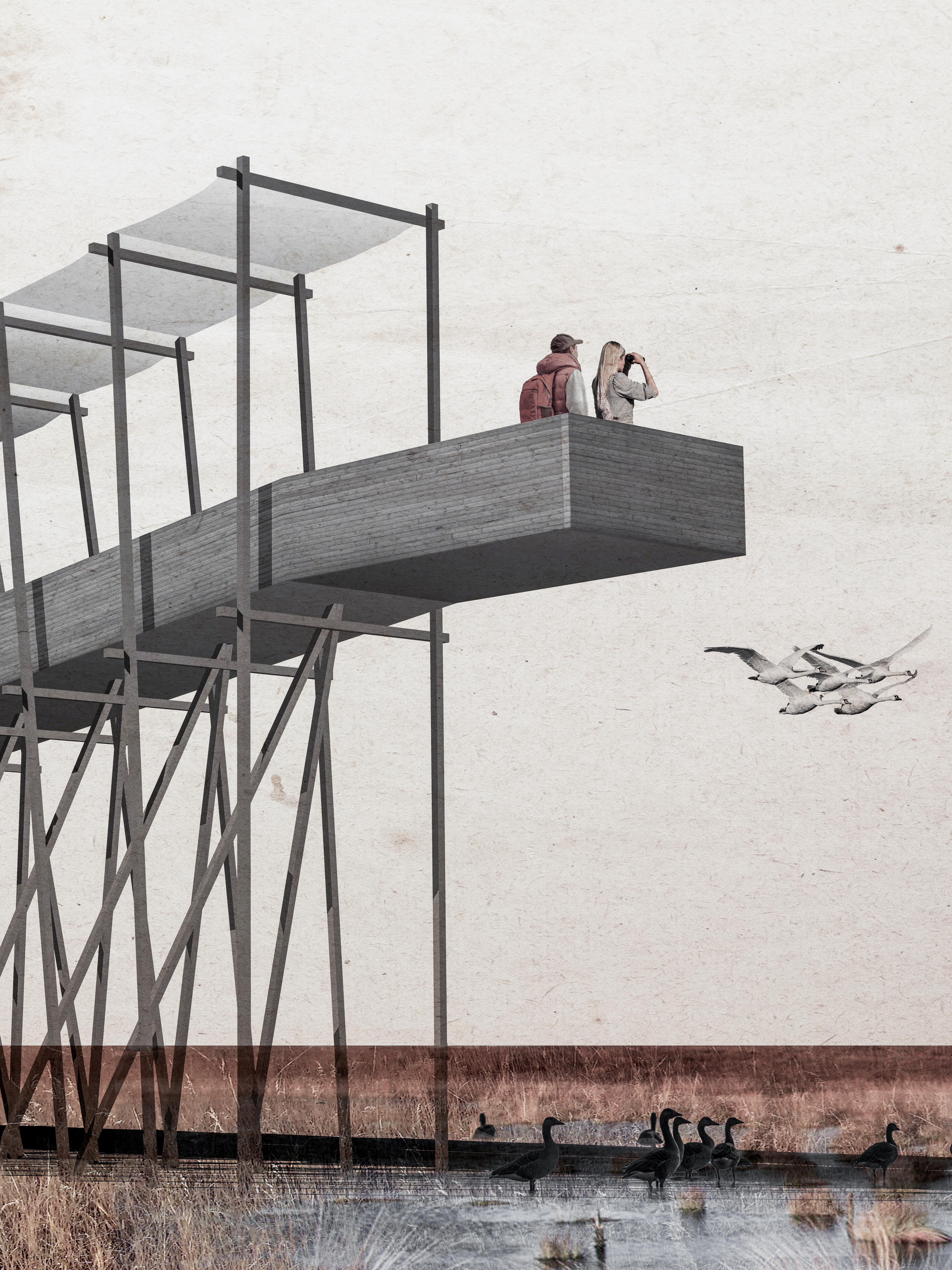 Um zur eigentlichen Beobachtungsplattform zu gelangen, muss der Weg über rund 50 Meter Sumpfgebiet zurückgelegt werden. Unser Beitrag sieht vor, den Weg zur Plattform in die architektonische Figur zu integrieren. So erhebt sich eine kontinuierlich ansteigende Rampe aus massiven Rahmenhölzern, umrahmt und getragen von einer filigranen Konstruktion aus der Landschaft. Geschützt von hellem Segeltuch, welches im Wind leicht flattert, lädt jeder Moment auf dem Weg zum verweilen ein.