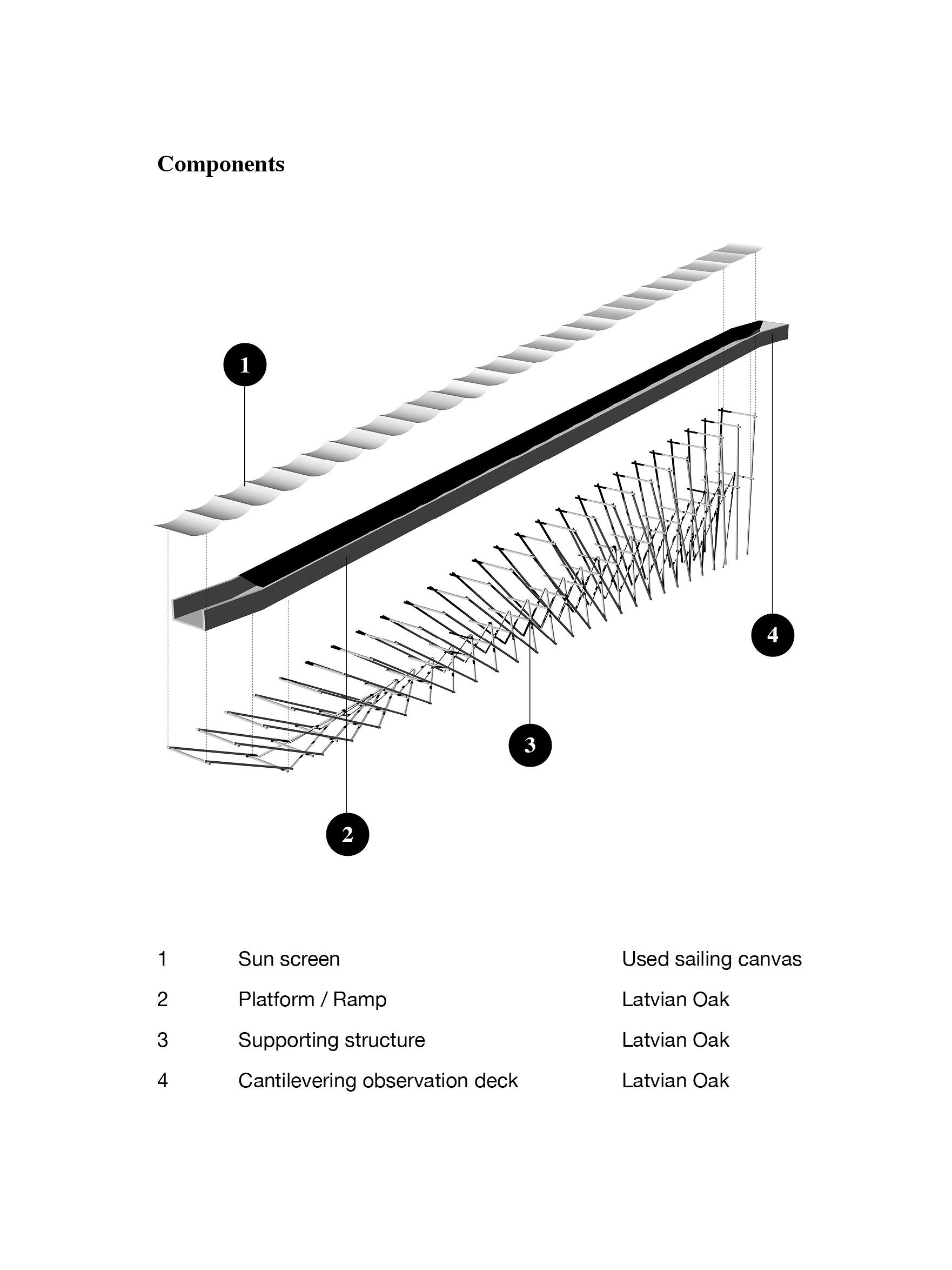 Der Naturpark Pape im Südwesten Lettlands wurde 2003 mit dem Ziel eröffnet, die Feuchtgebiete der Region zu schützen. Der fast 11.000 Hektar grosse Park umfasst wichtige Nistplätze für 250 Zugvogelarten in den Sümpfen an der Grenze zwischen dem Papes-See und dem Meer. Aufgabe war, eine neue Vogelbeobachtungsstation zu entwerfen, die eine bestehende, 1966 erbaute und durch einen Brand zerstörte Struktur ersetzen sollte. Der Beobachtungsturm dient in erster Linie dazu, die jährlichen Zuggewohnheiten von schätzungsweise 50.000 Vögel zu dokumentieren und den Parkbesuchern die Möglichkeit zu geben, die natürlichen Schönheiten des Parks zu erleben.